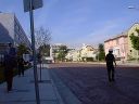 Picketers stroll down LRH Way in spite of the film permit, thanks to the LAPD. Left: Scientologist Armando (in the black suit), who had good confront and high tone level; center: picketers, carefully staying on the sidewalk; right: the film set. |