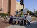 Group photo - left to right: Xenu, Rondata, Snefru, Don NOTS, Taniwha, Neal Hamel (in hat, partially hidden), Zinjifar (kneeling), Administrati, Michael Pattinson, new picketer Donna (her sign says "Scientology stole my daughter"), and Dennis Erlich, on the phone to the ARSCC(wdne). |
