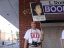 Picketers at FOLO on Hollywood Blvd: Snefru gives info to a passerby, Administrati chats with Dennis Erlich, and picketers show their signs in the background. |